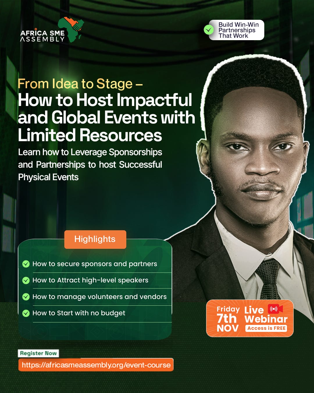 In this live webinar on 7th November 2025, I’ll pull back the curtain on the strategies that have helped us attract top sponsors and speakers for the Africa SME Assembly build an efficient team and monetize our event. You’ll get actionable templates, ready‑to‑use scripts and a complete toolkit to plan, promote and profit from your own events.